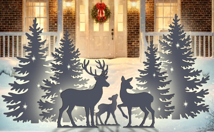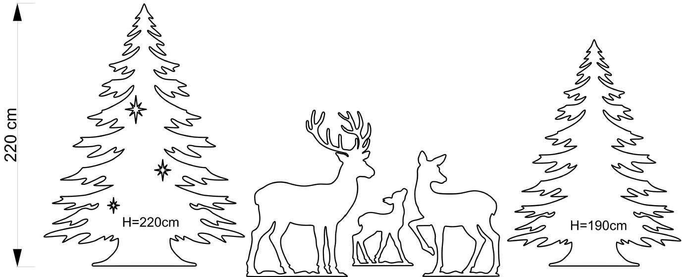 Продаю чертежи контуров оленей и елок. Высота большой елки 220 см. Можно вырезать по контуру, затем приложить к фанере и обвести. Затем лобзиком вырезать по контуру и сзади фанеры приклеить гирлянду. Получится нечто подобное.