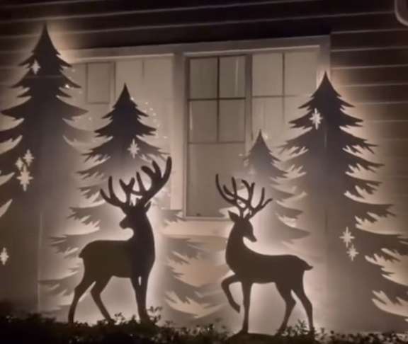 Продаю чертежи контуров оленя и оленихи с елкой. Высота елки 200 см. Высота большого снеговика 150 см. Можно вырезать по контуру, затем приложить к фанере и обвести. Затем лобзиком вырезать по контуру и сзади фанеры приклеить гирлянду. Получится нечто подобное.
