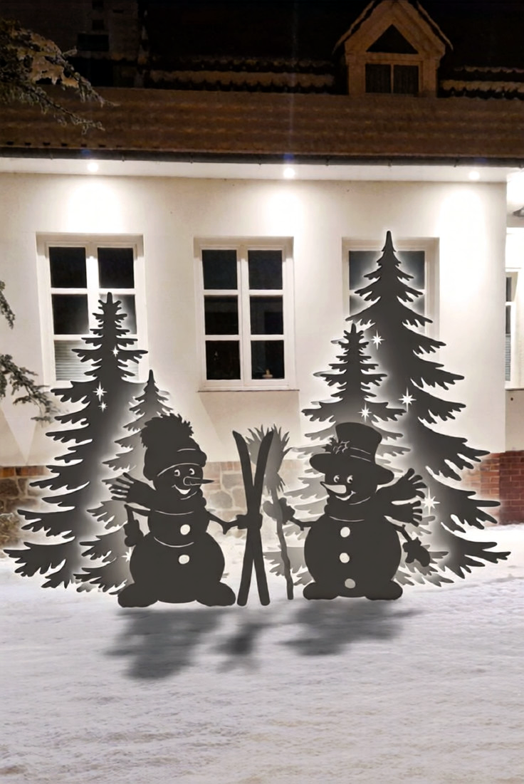 Продаю чертежи контуров оленей и елок. Высота елки 200 см. Высота большого снеговика 150 см. Можно вырезать по контуру, затем приложить к фанере и обвести. Затем лобзиком вырезать по контуру и сзади фанеры приклеить гирлянду. Получится нечто подобное.