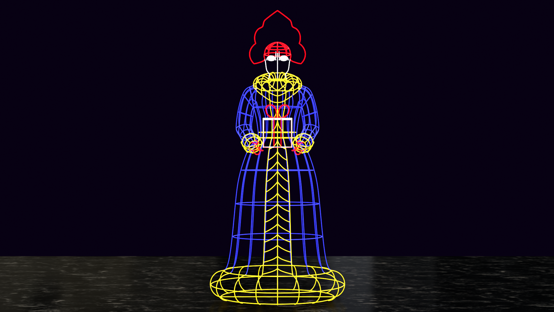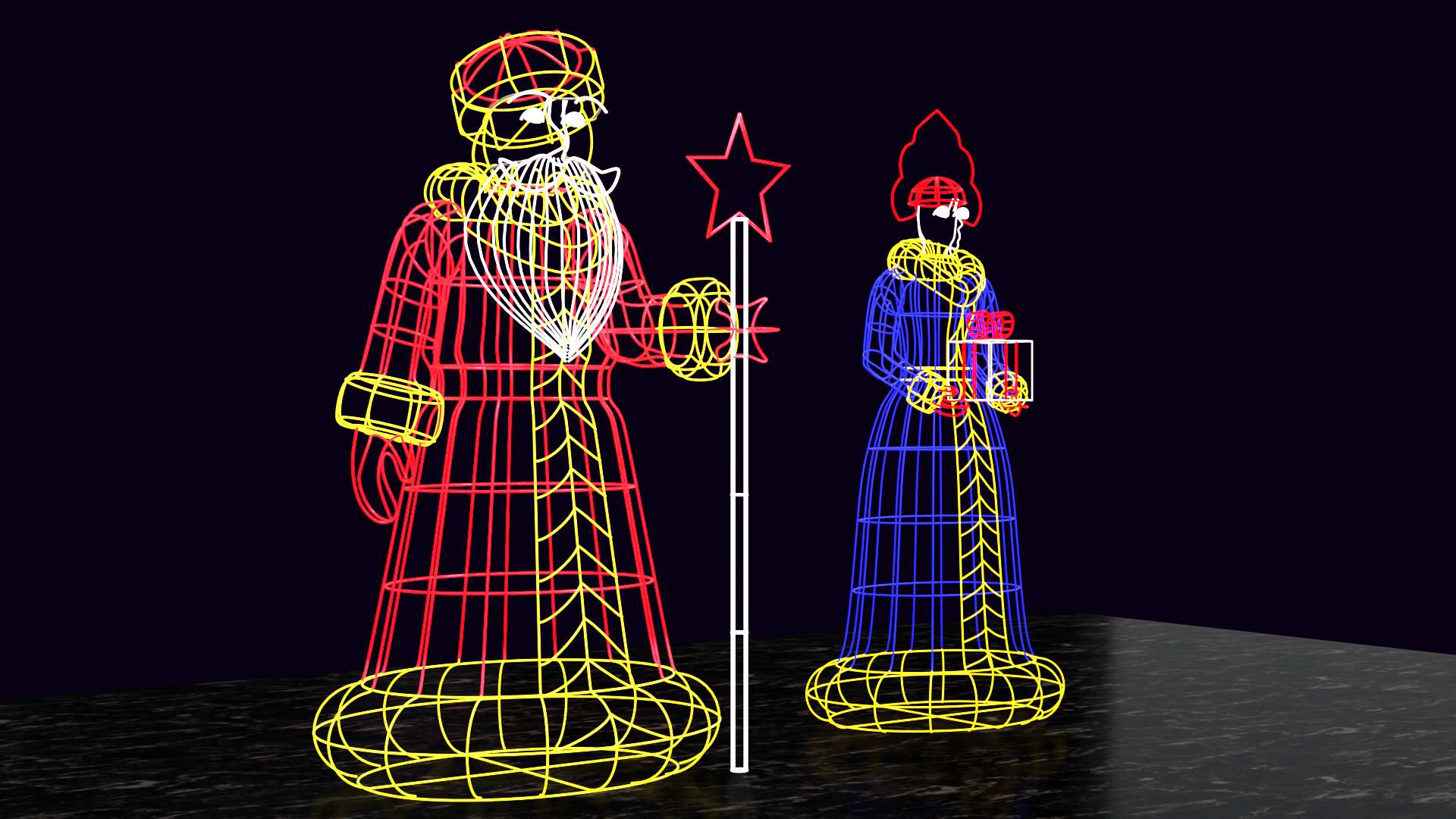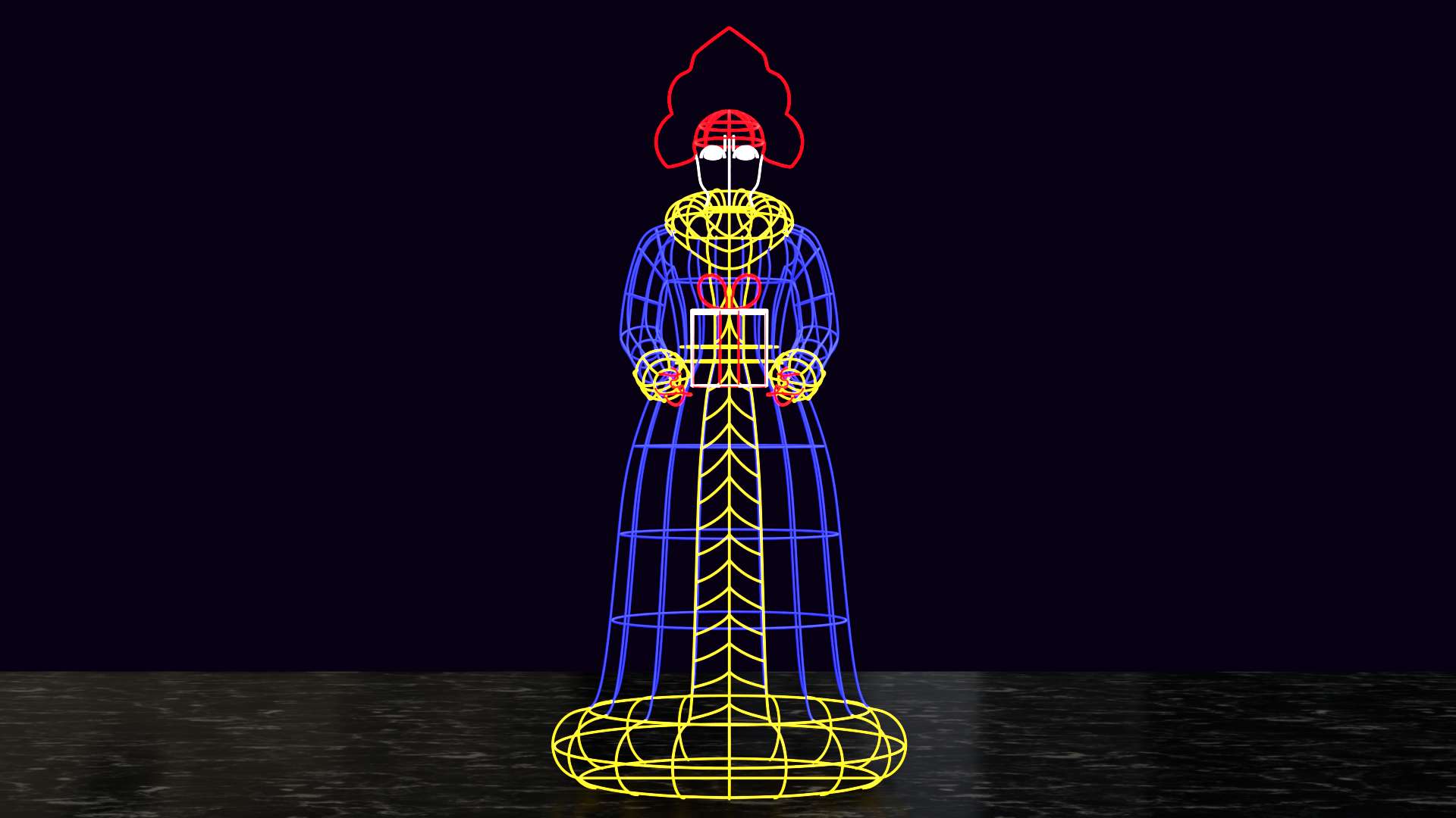 Объёмная фигура состоит из прочного стального металлического каркаса. Каркас более заметен после окрашивания в белый цвет, так как белый полностью рассеивает свет диодов без поглощения.