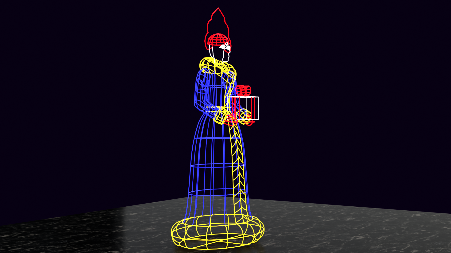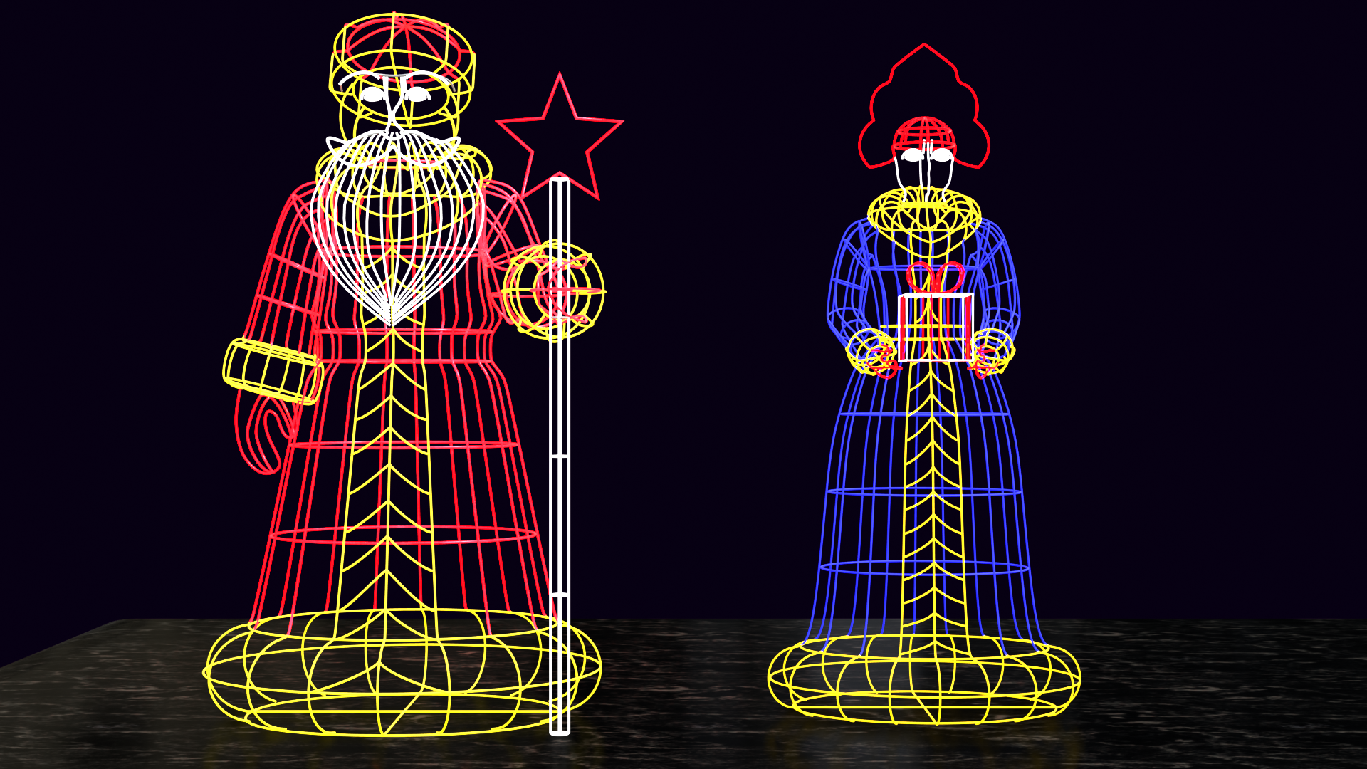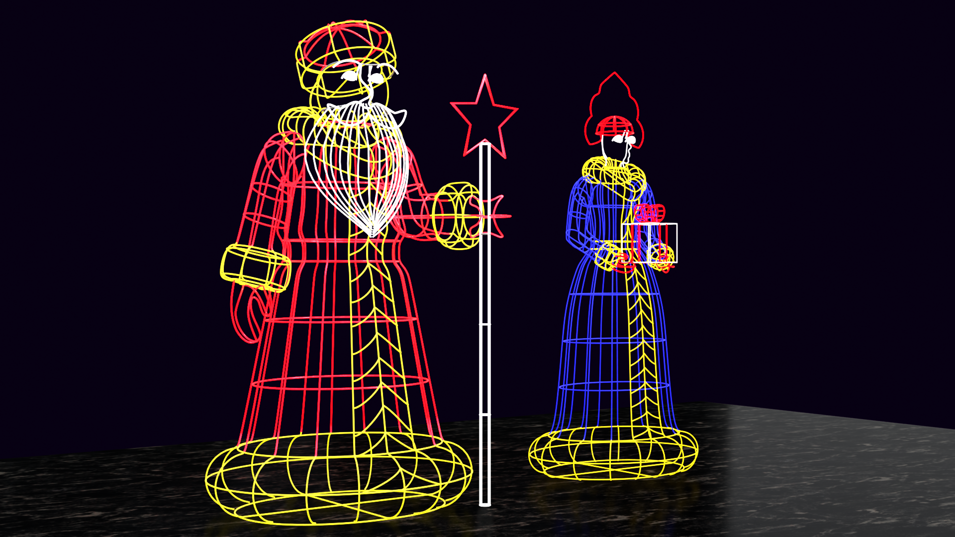 Объёмная фигура состоит из прочного стального металлического каркаса. Каркас более заметен после окрашивания в белый цвет, так как белый полностью рассеивает свет диодов без поглощения.